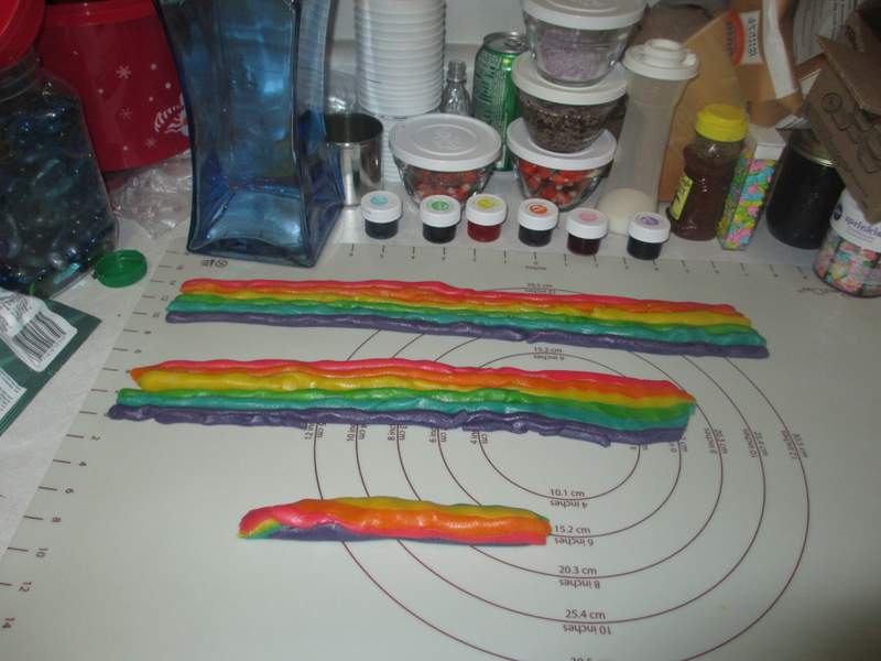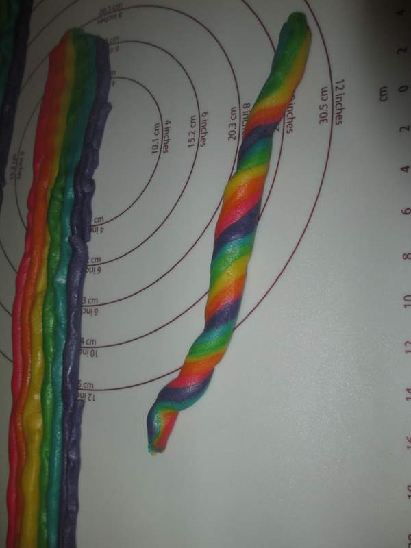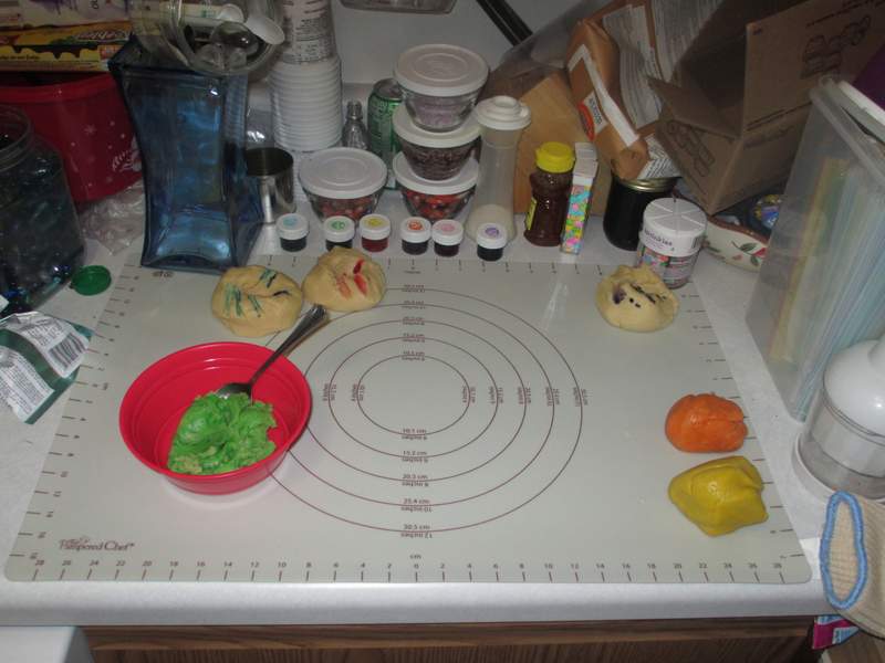 Separate into 6 sections for coloring. I don’t bother to use flour when manipulating the dough, I just use my Pampered Chef silicon mat.