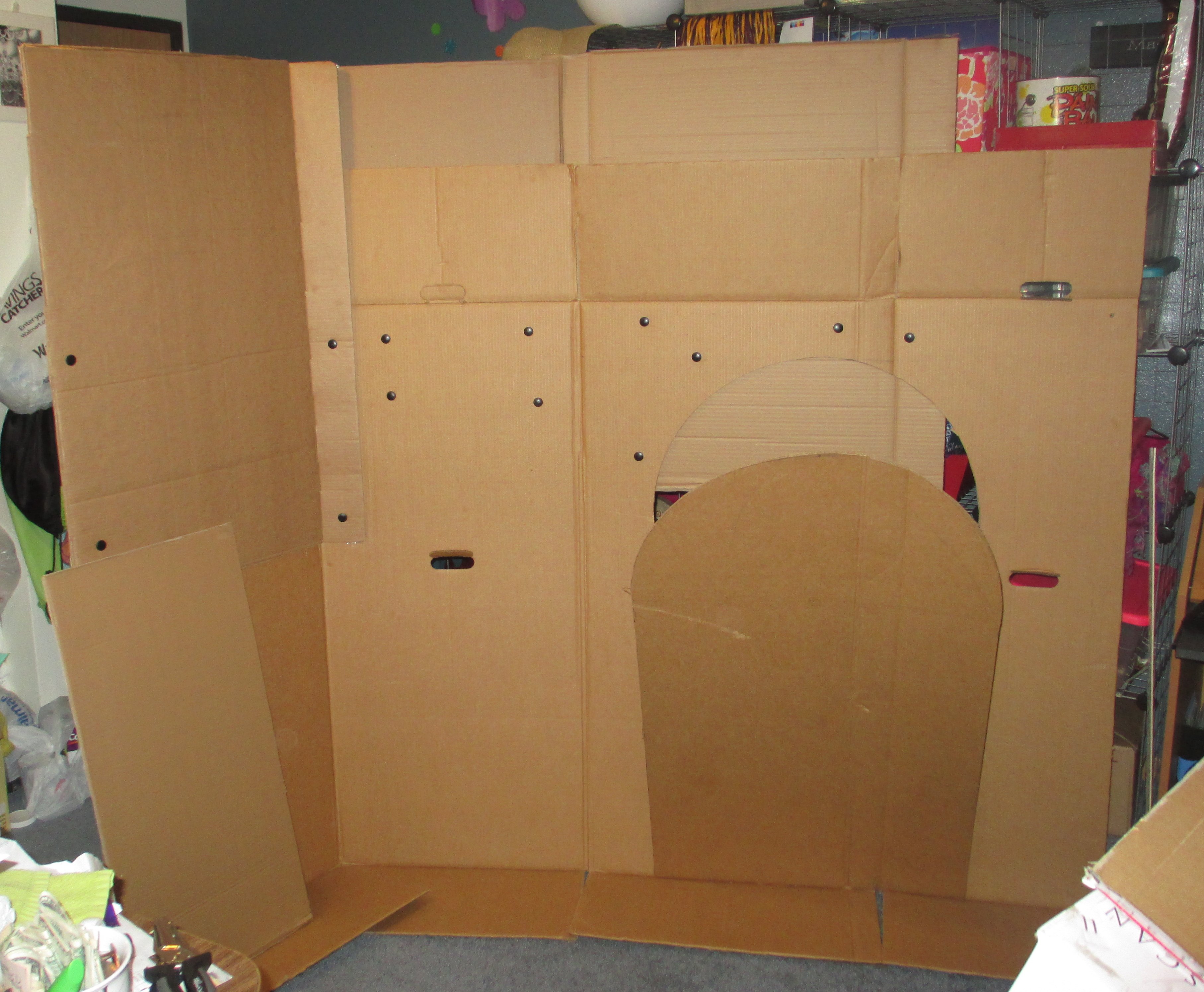 I think the box rivets worked better than the tape and glue would have. I cut the drawbridge after I had connected the cardboard. I used a string to draw a circle for the top of the door, cutting the curve wasn’t as hard as I thought it would be.