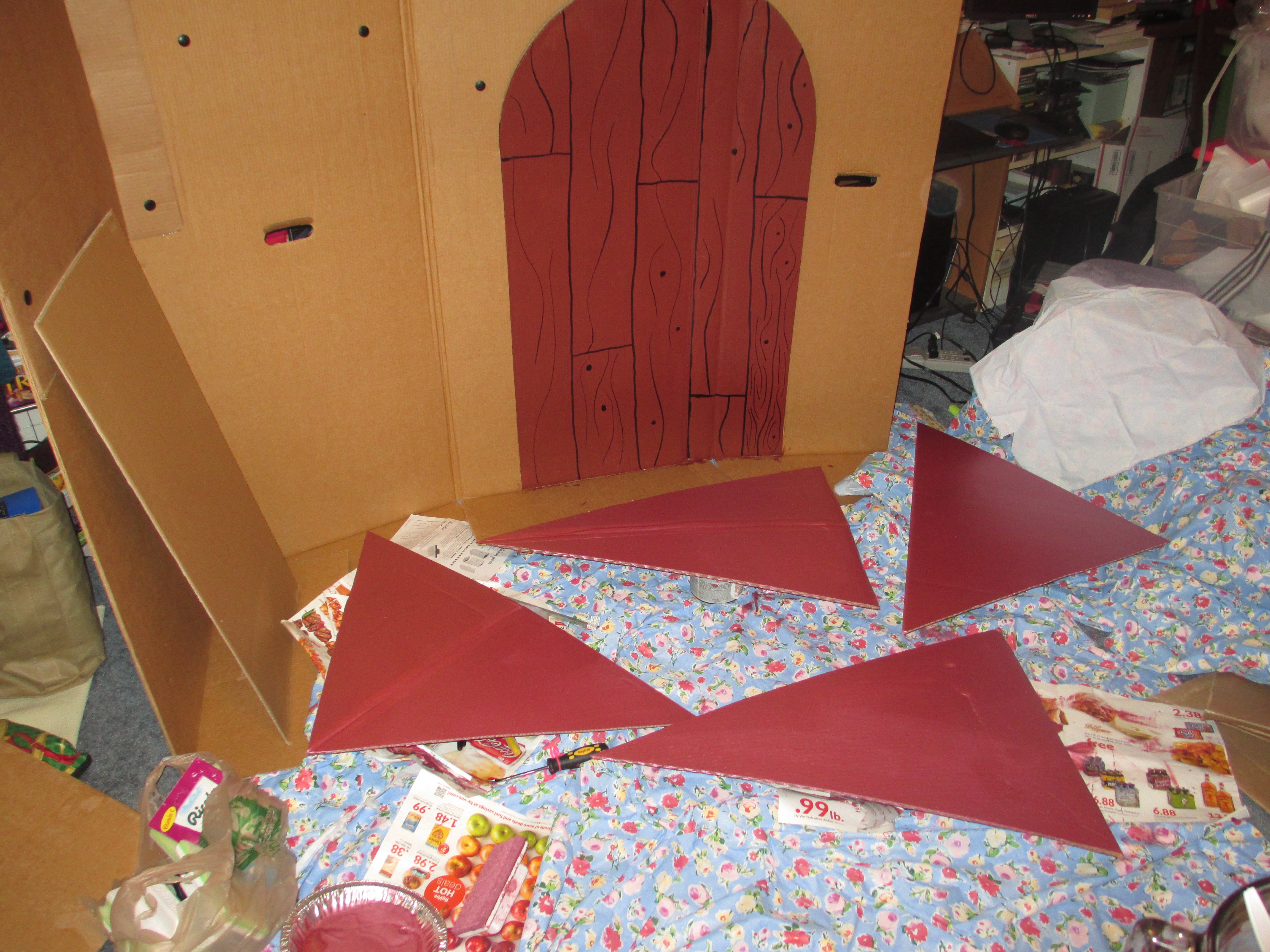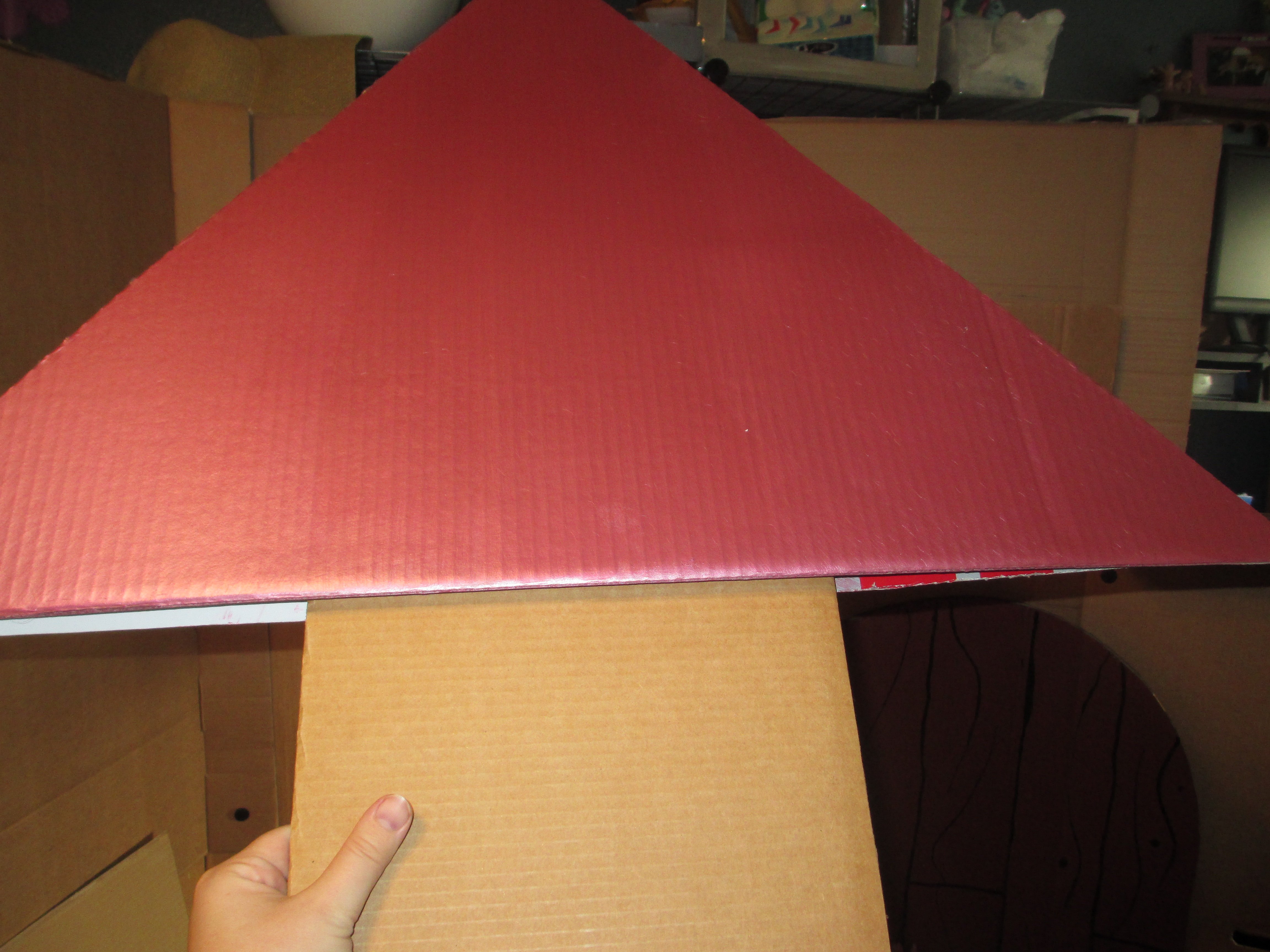 I started with some large cardboard boxes my friend had in her basement. I connected them using Mr. McGroovy’s box rivets (https://mrmcgroovys.com/). I had planned to use hot glue and duct tape, but I found the Mr. McGroovy website when I was looking for painting ideas and it some really good suggestions – if you are going to do any sort of cardboard construction, definitely check out that website.