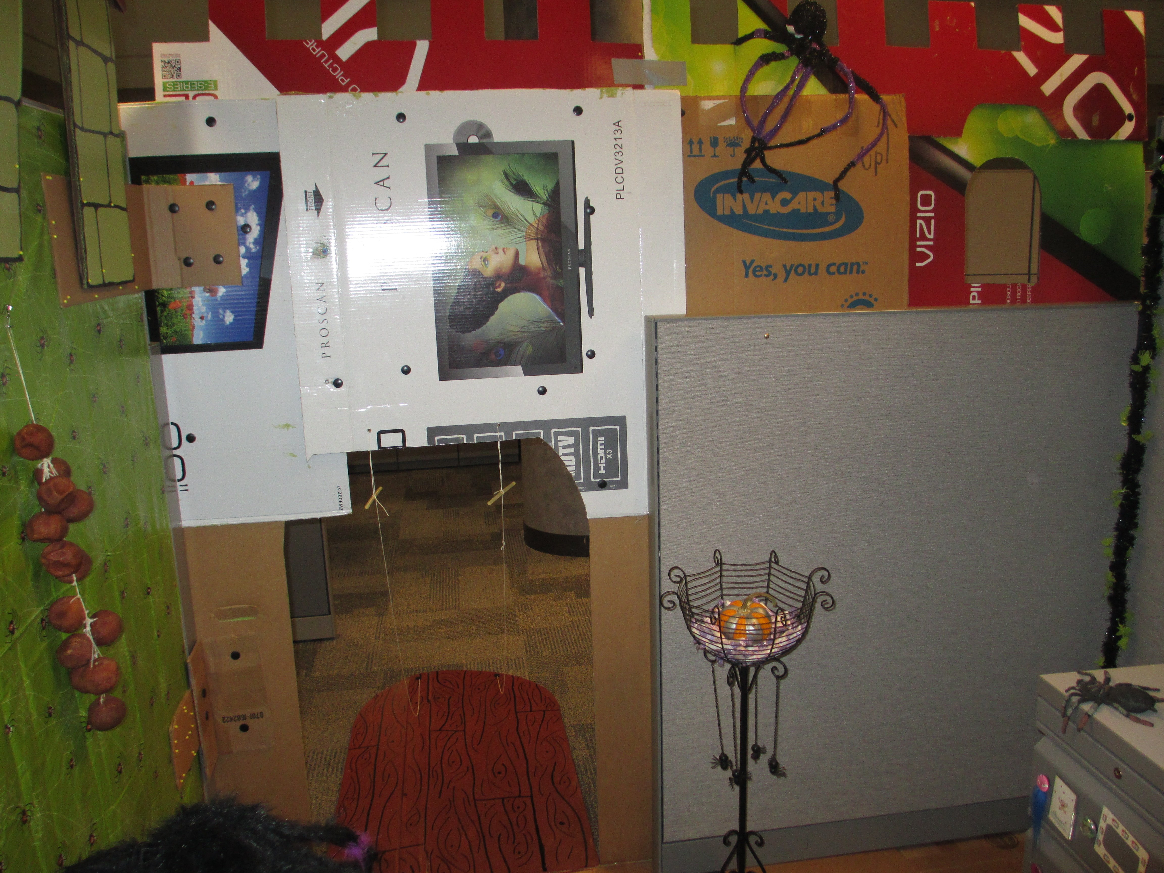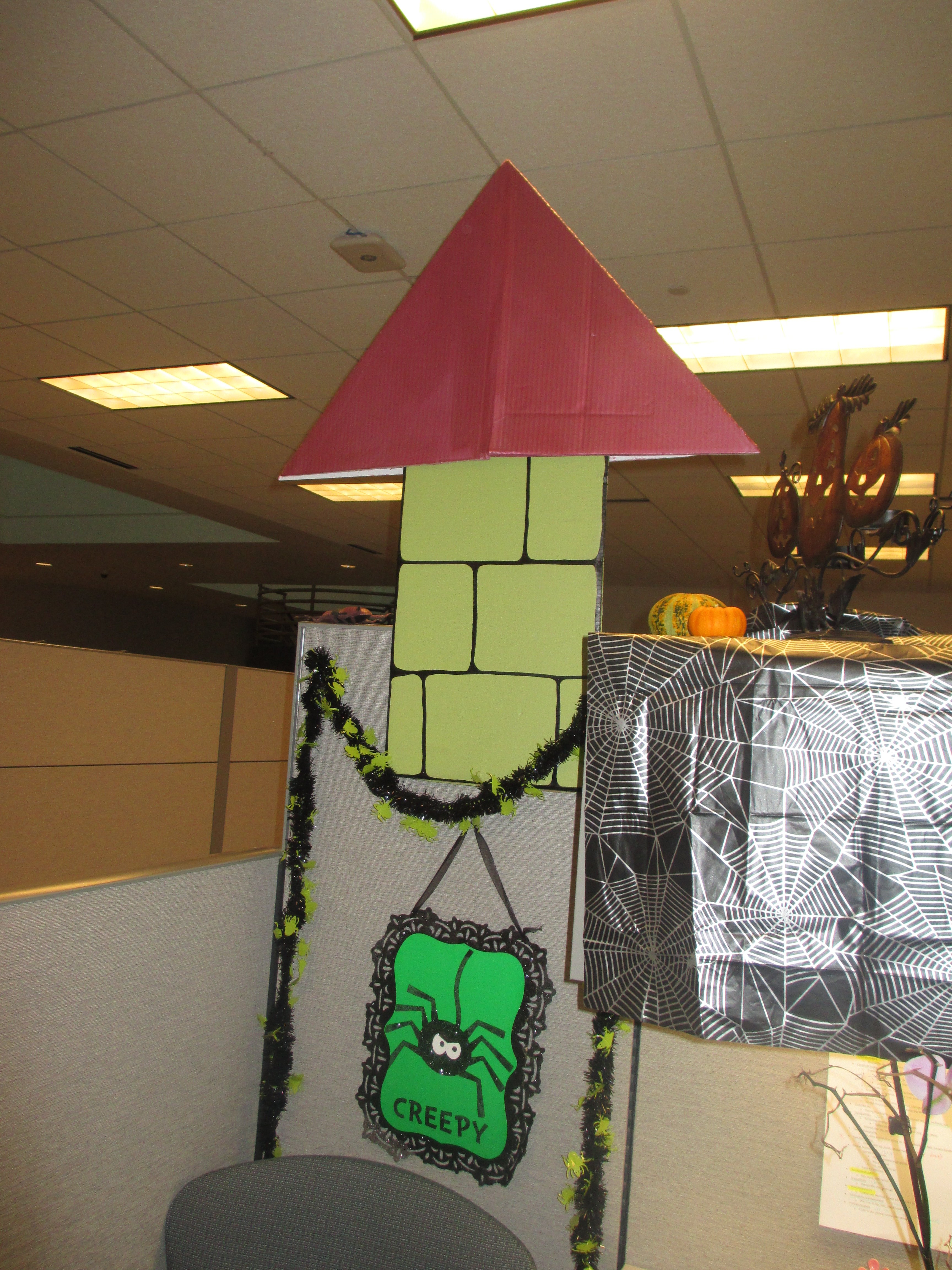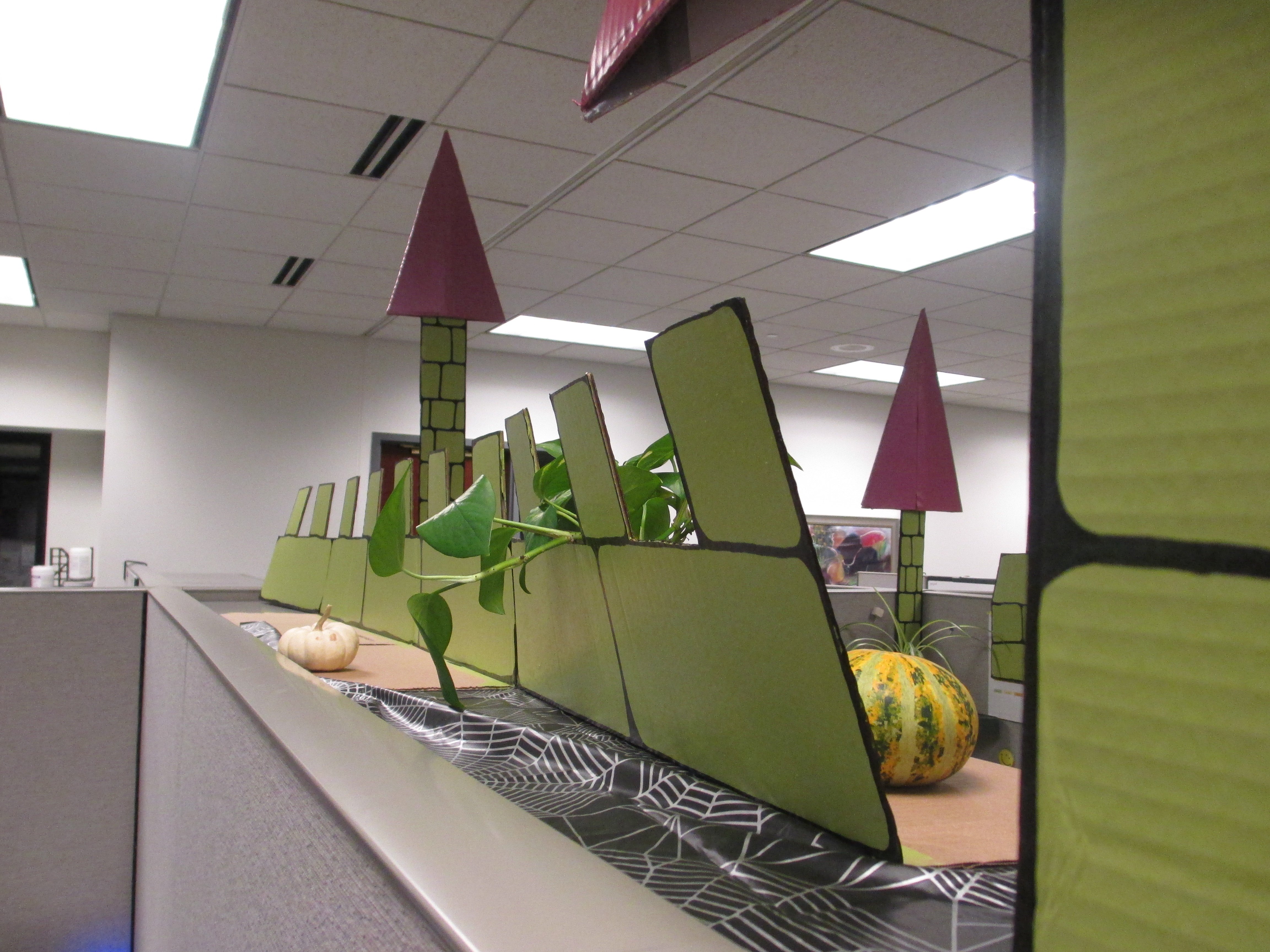 The crenelations were made from one long piece of cardboard. I attached one side to the cubicle with straight pins. The other side was on top of the overhead. I folded the bottom and weighted it down to make it stand.