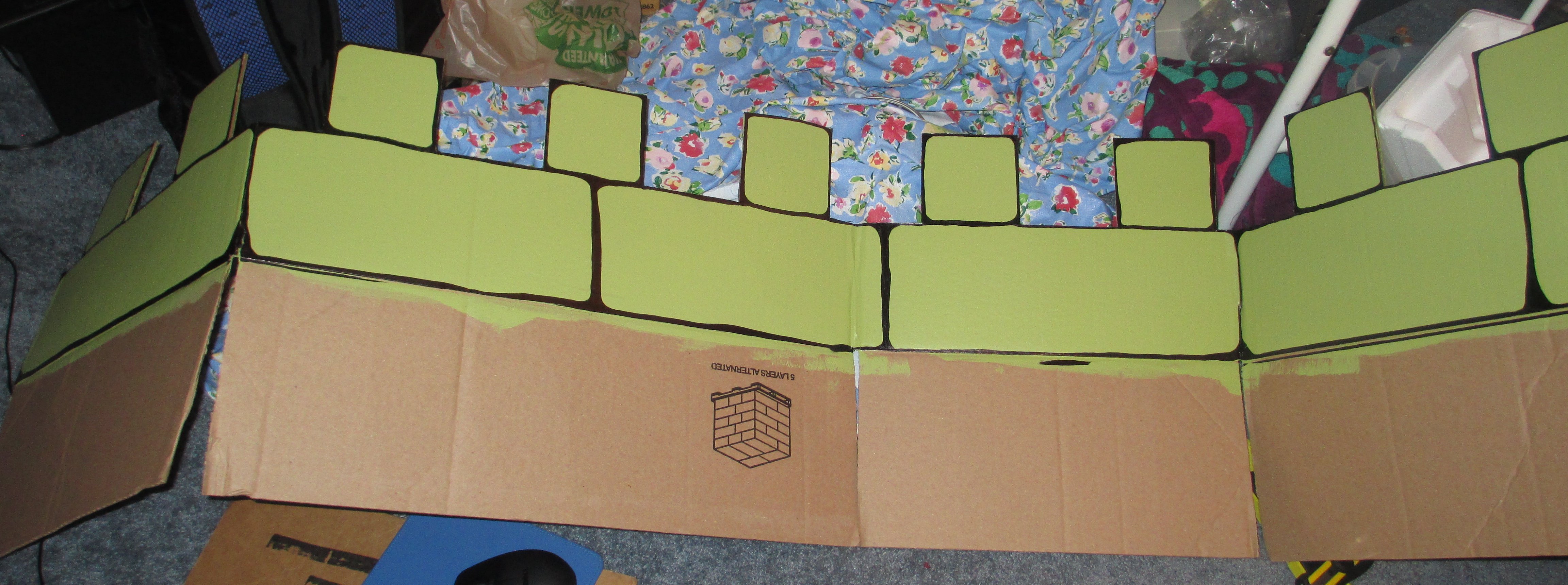 I took almost week to put the castle up. I started with the rear two towers on Tuesday, then added the front two towers on Wednesday, the crenelations went up Thursday, and the front panel was up for Friday.