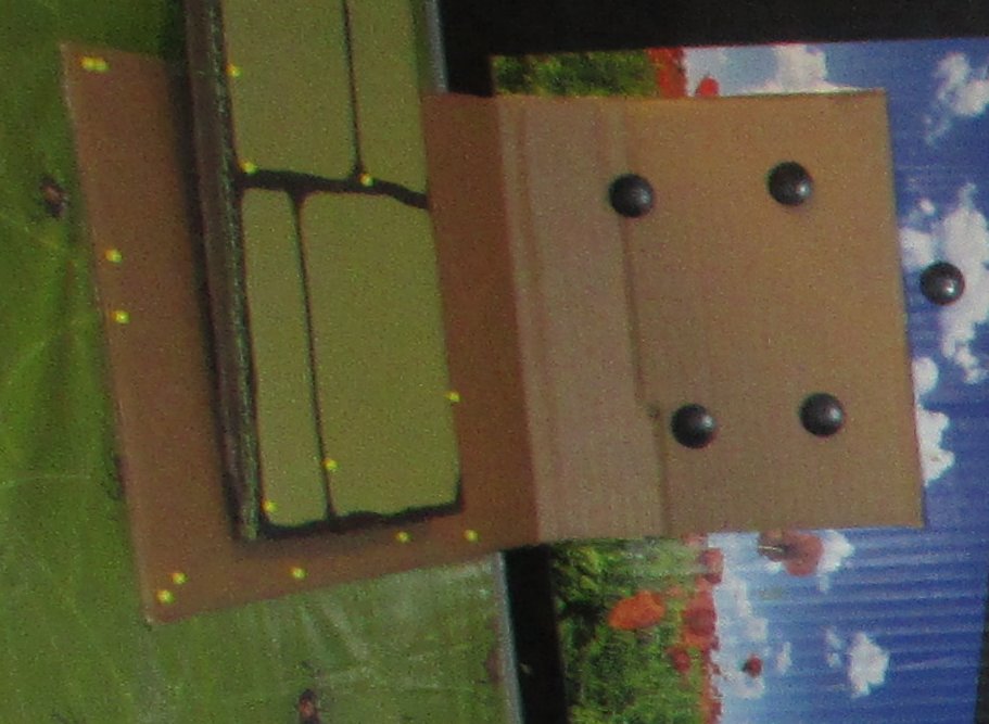 The front panel is held up with a lot of straight pins. Putting the pins straight in – like I did for the towers and crenelation – didn’t work, they just pulled out. Used the pins in pairs, at opposite angles.