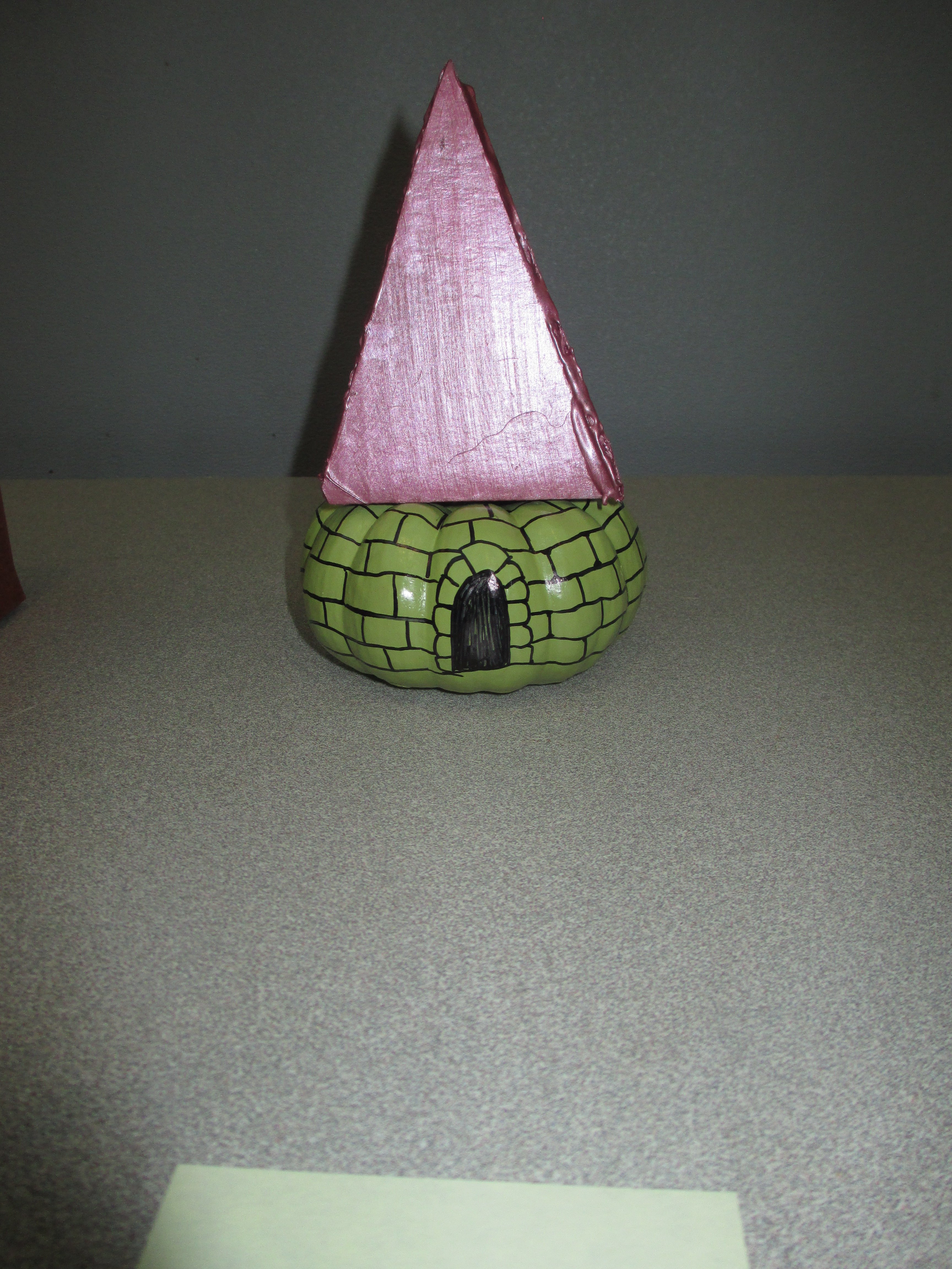 I wanted to do something that tied in with my cubicle castle, so I started painting my pumpkin to match it. Then I realized I didn’t have enough time for that, so I dipped the whole pumpkin in the paint can. (it did take a while to dry…)