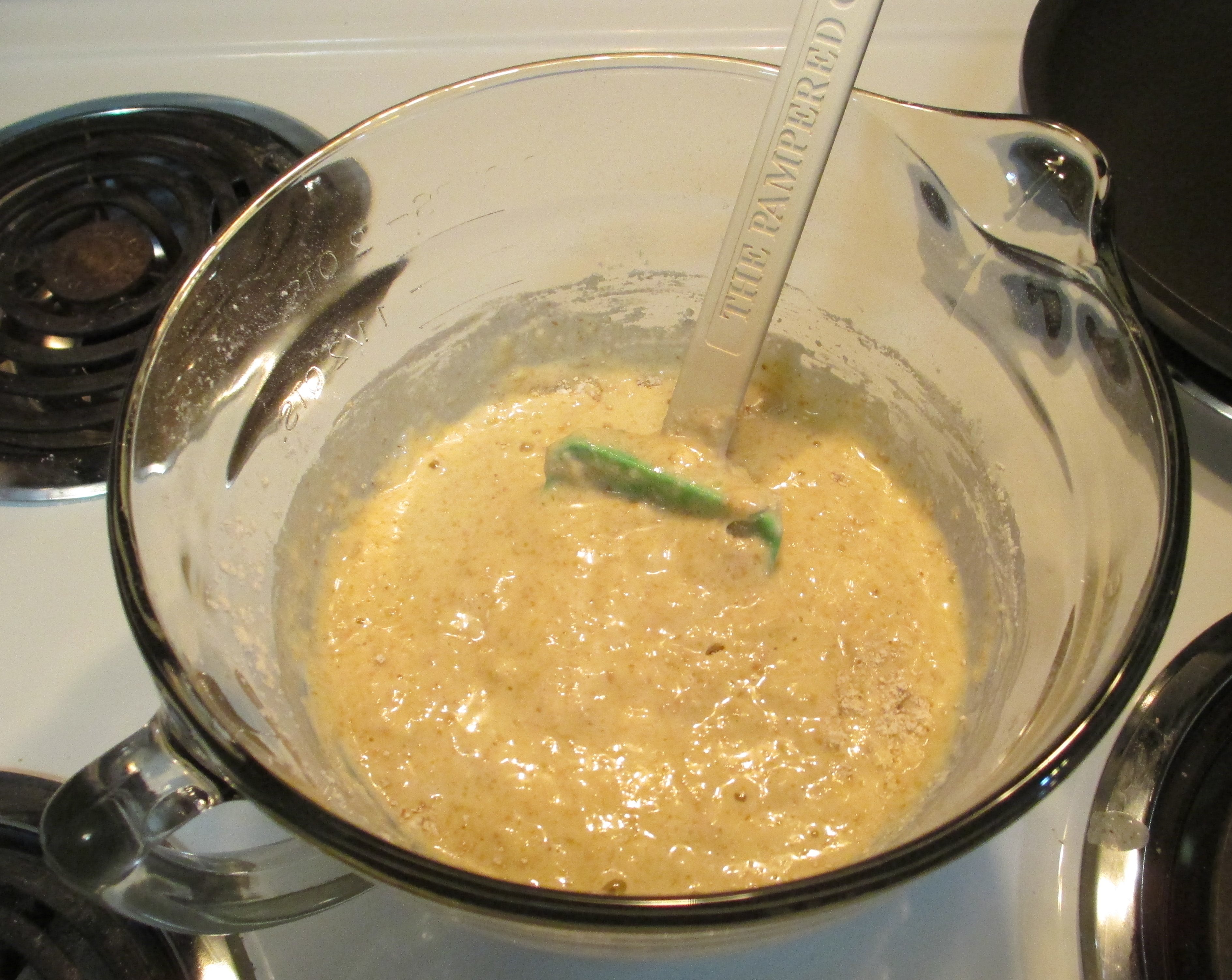 Add wet ingredients to dry. Stir (but not too much, as little as possible, don’t worry about getting out the lumps)