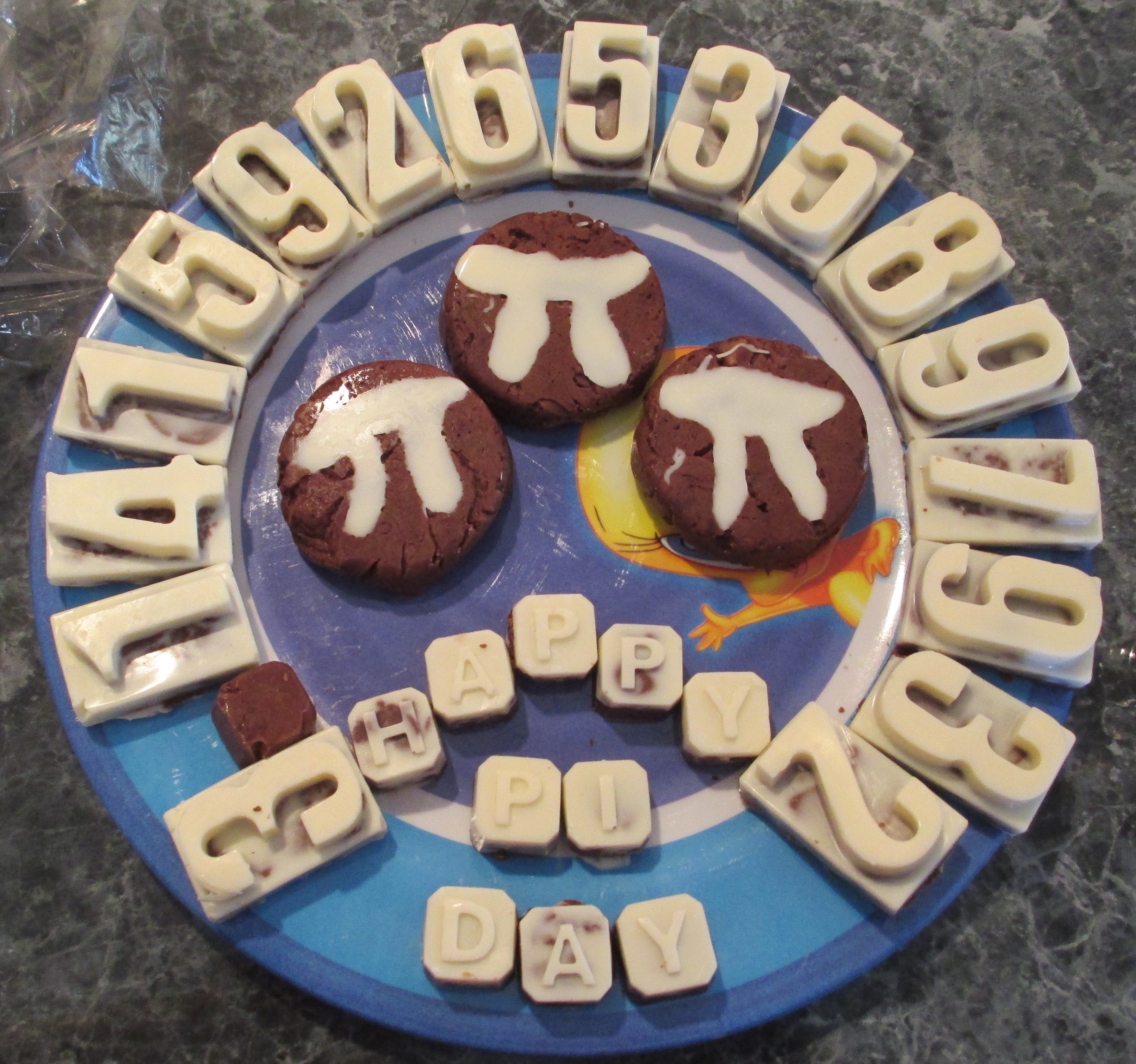 Pi Fudge. I had to make three batches to get enough digits and enough p’s for “Happy Pi Day”. I bought the silicone molds for the numbers and letters on Amazon (http://smile.amazon.com/gp/product/B00M16L9ZQ/ref=oh_aui_search_detailpage?ie=UTF8&psc=1). They ended up being a really good size for fudge.