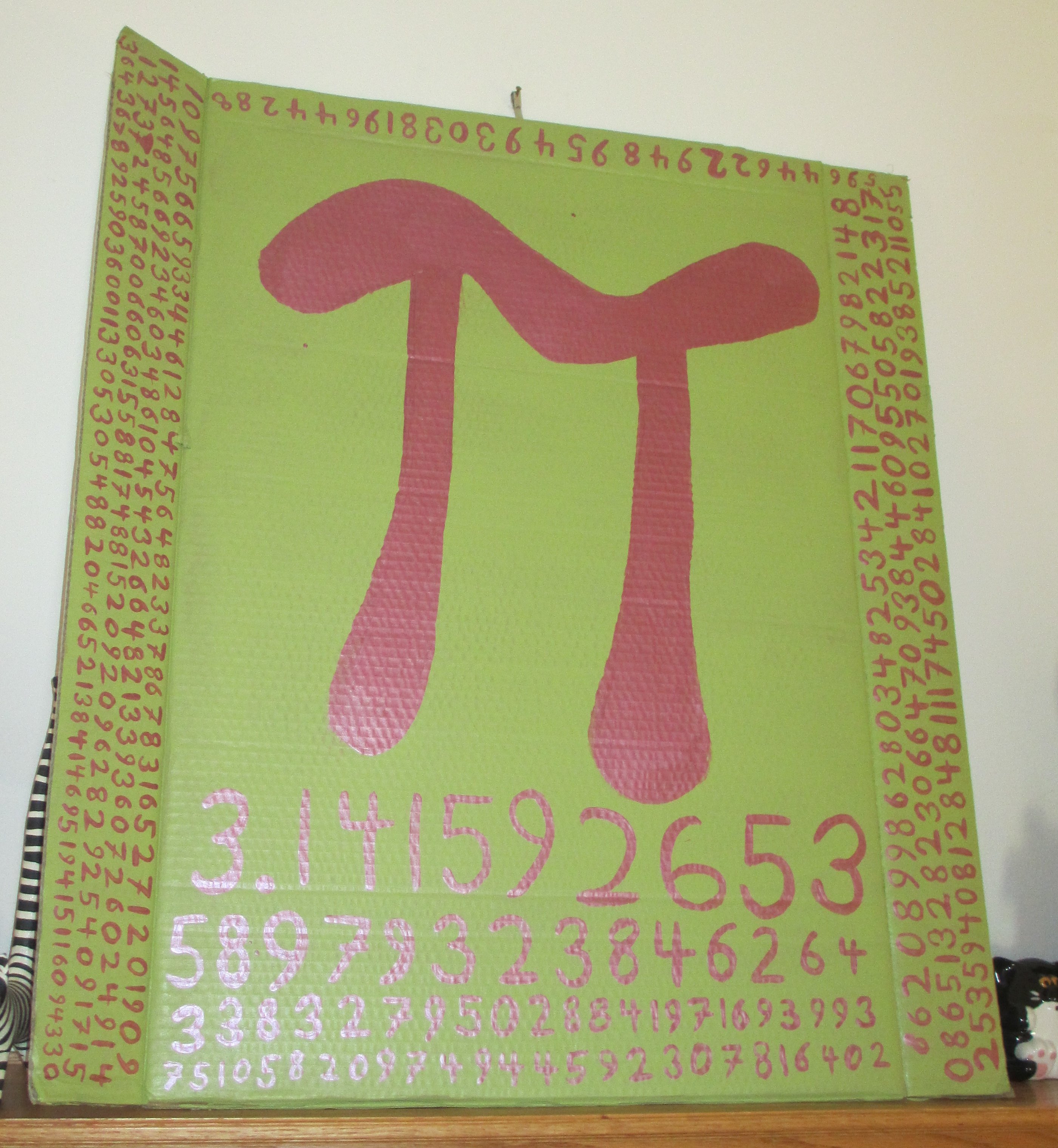 Last year I made some epic decorations for Pi-Month. I cut numbers out of cereal boxes, each about six to eight inches tall. I painted each one individually, mostly solid colors, some with two blended colors. I don’t remember how many digits I had, but I’m pretty sure it was more than 50. I had a larger piece of thin cardboard cut in the shape of pi and painted rainbow colors in a tie-dye pattern. And I can’t find any of them.