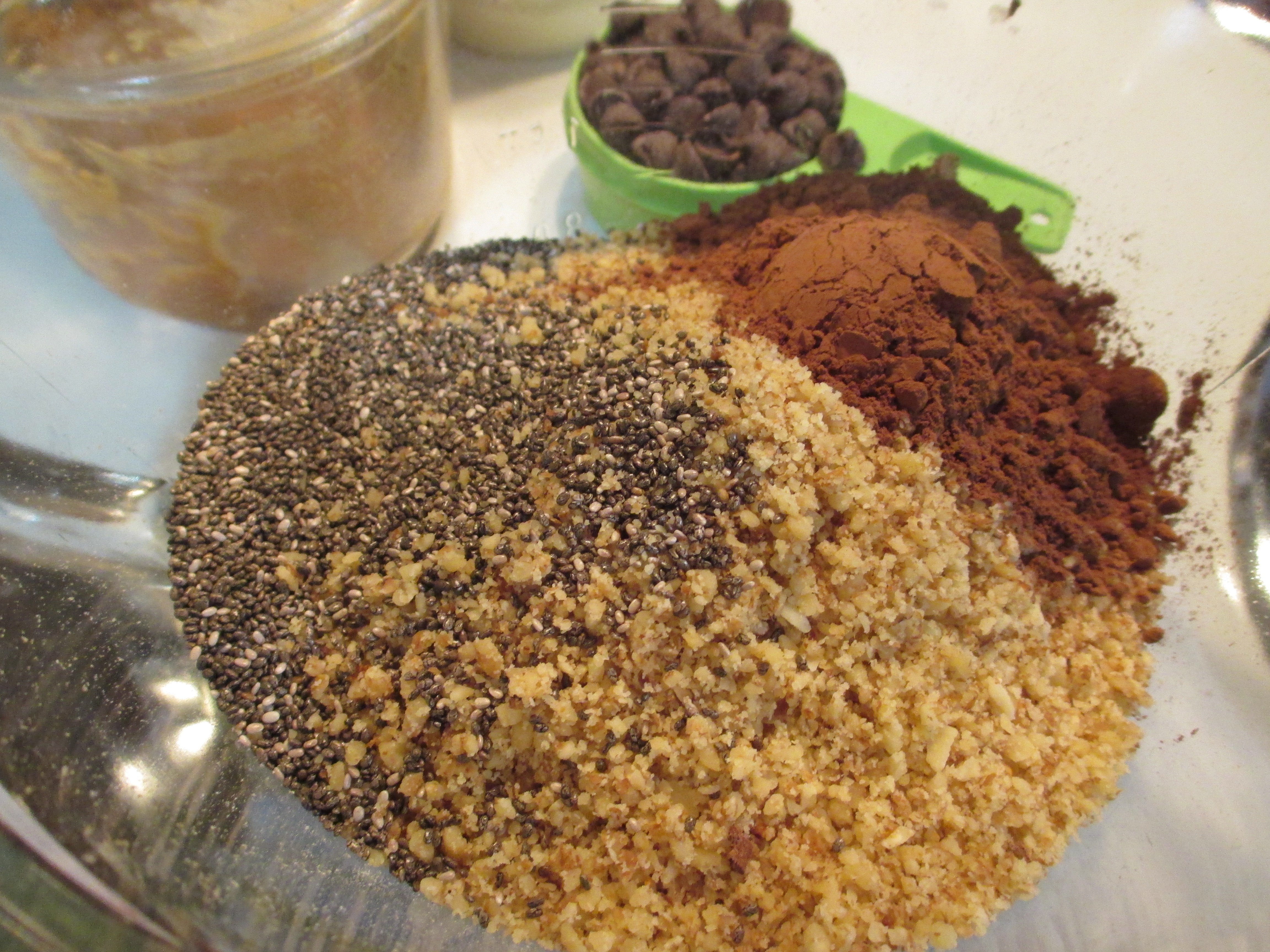 That’s when I googled ‘energy bites’ and realized that it was a thing. I found some recipes and combined them into something that sounded good to me. I listed some of the more influential recipes at the bottom of the page. Most of the recipes had coconut and ground flax – and I wanted to replace those. A while ago I researched flax and chia and I learned that to get the omega 3 from flax seed, you have to grind it, and it looses effectiveness quickly after it’s ground. As I don’t have any equipment or interest in grinding my own flax seed, I tend to favor chia. As for coconut – I just really don’t like the texture of dried coconut.