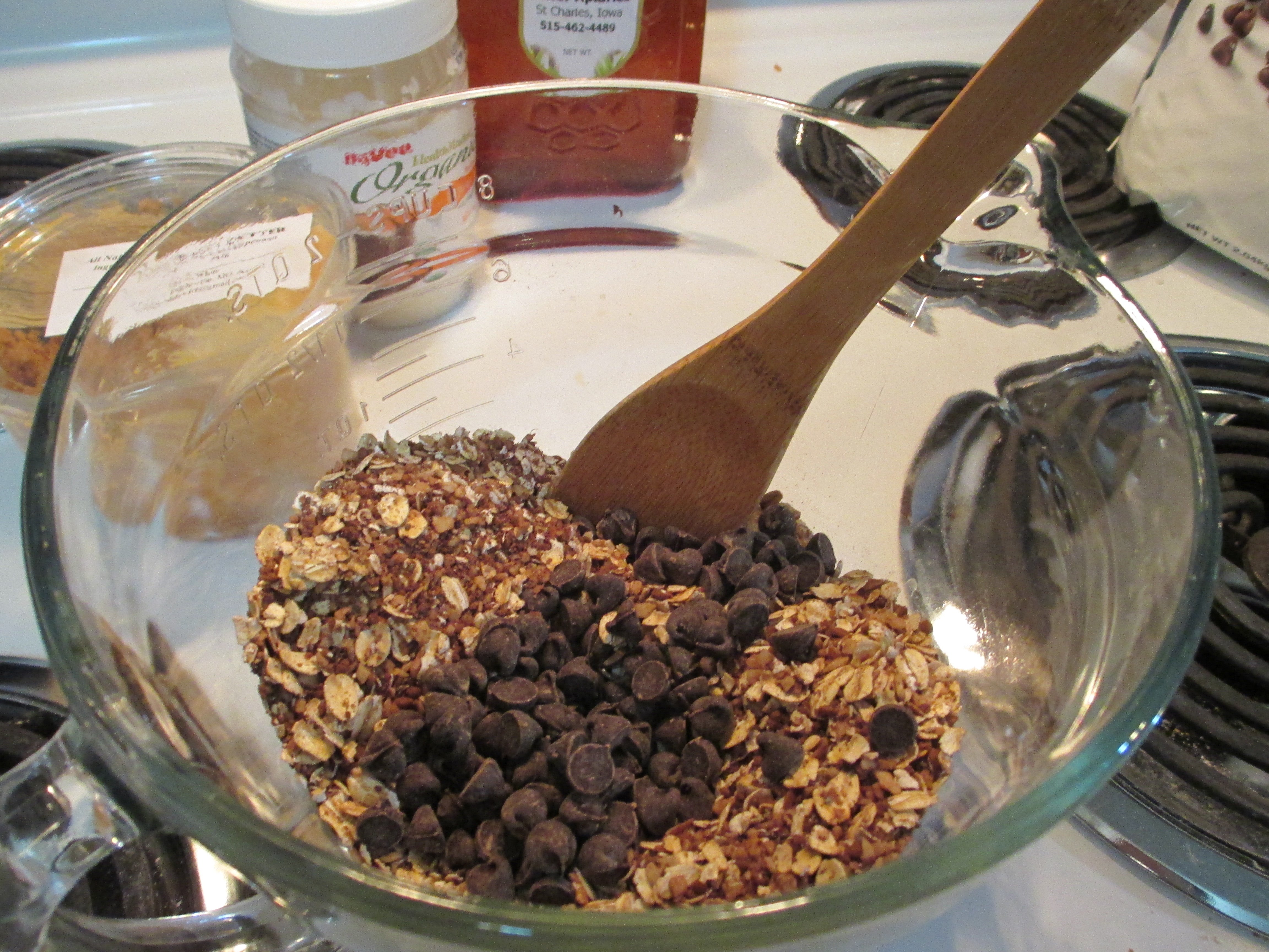 Some people might prefer mini chocolate chips – but I like the big ones. The darker the better of course. I use Costco brand semisweet chips that are 51% cocoa. Lately I have been using one cup of chocolate chips instead of 1/3 cup, because I keep forgetting to check the recipe. It turns out delicious, but doesn’t tolerate heat as well.