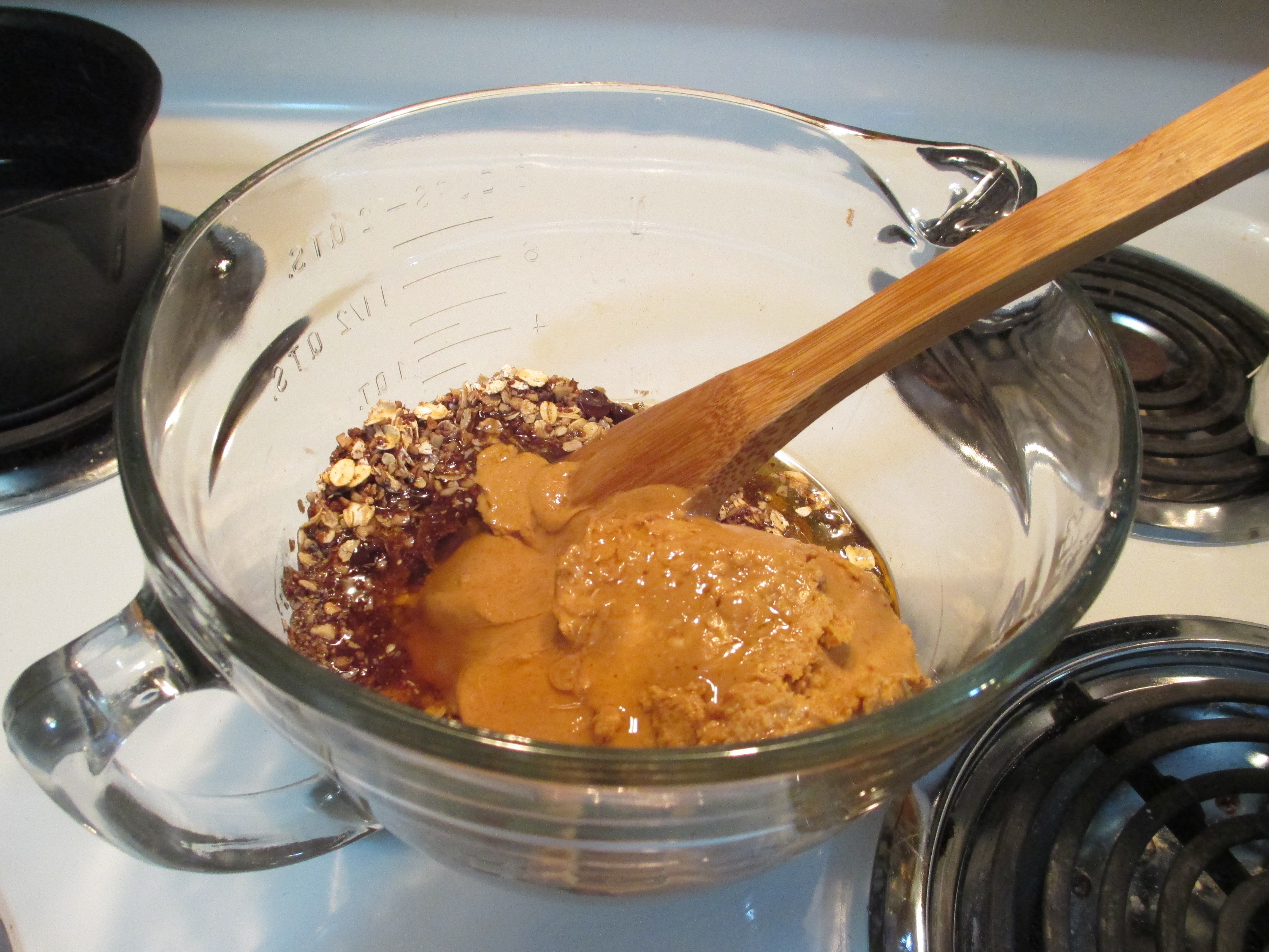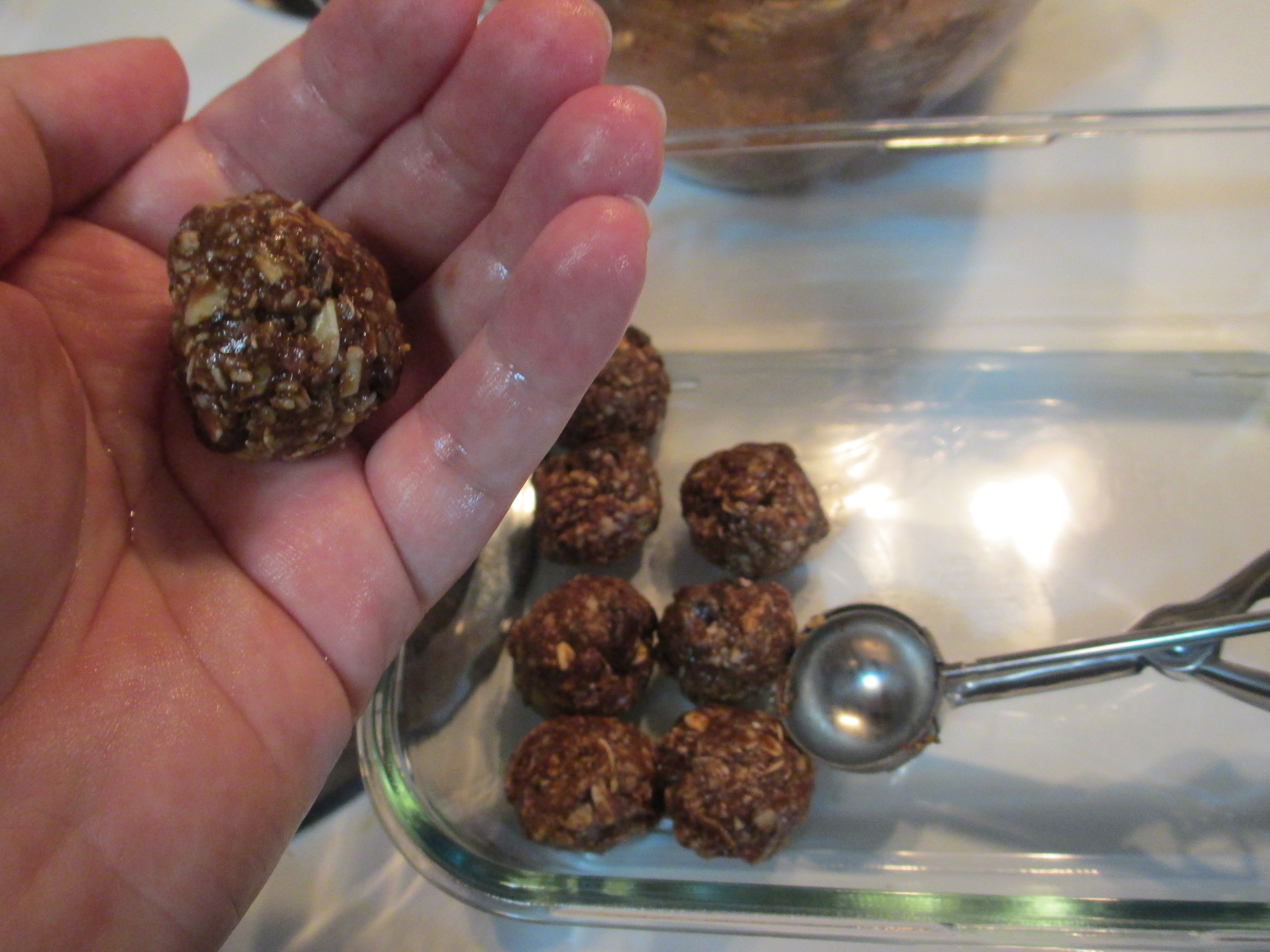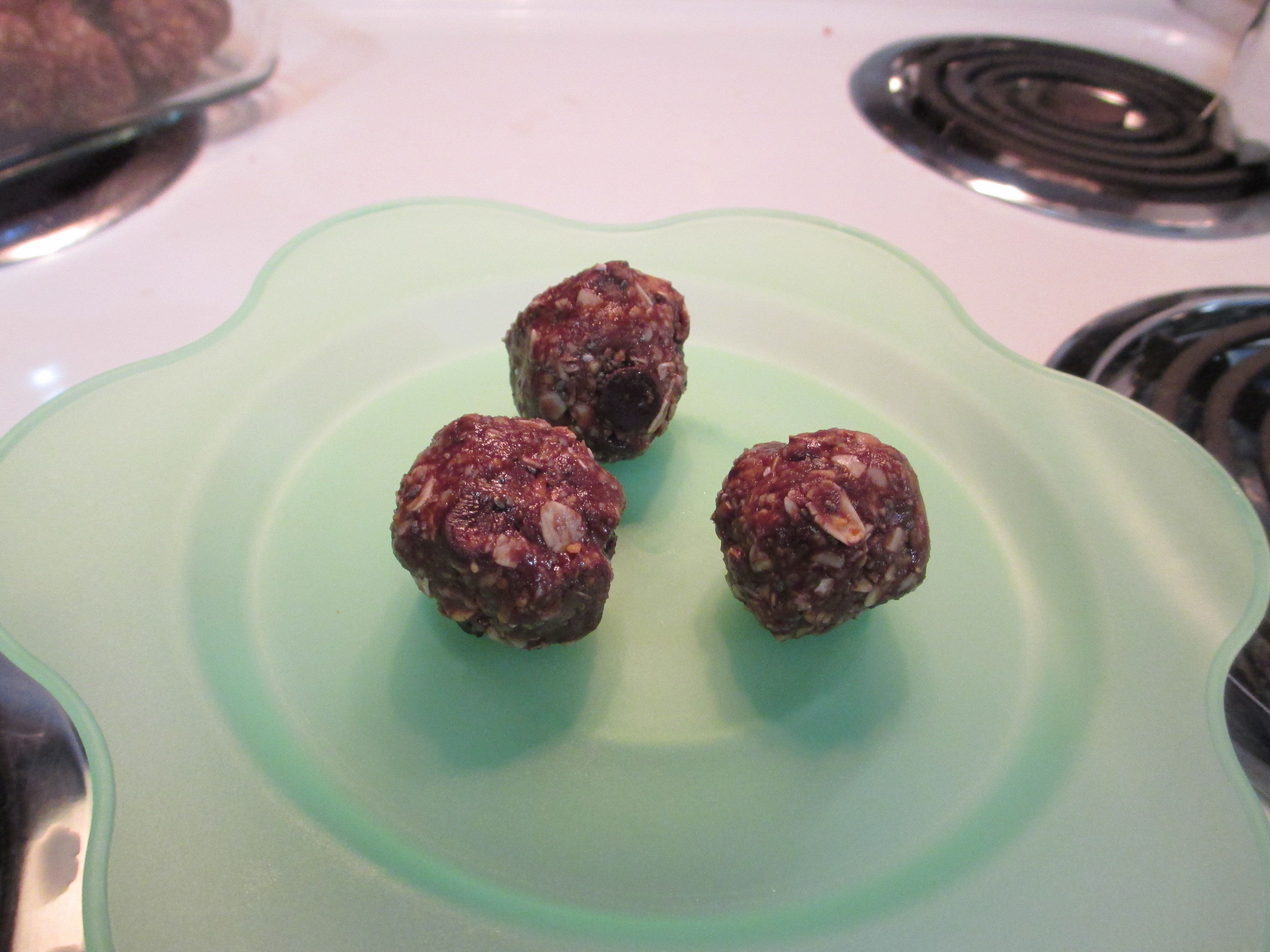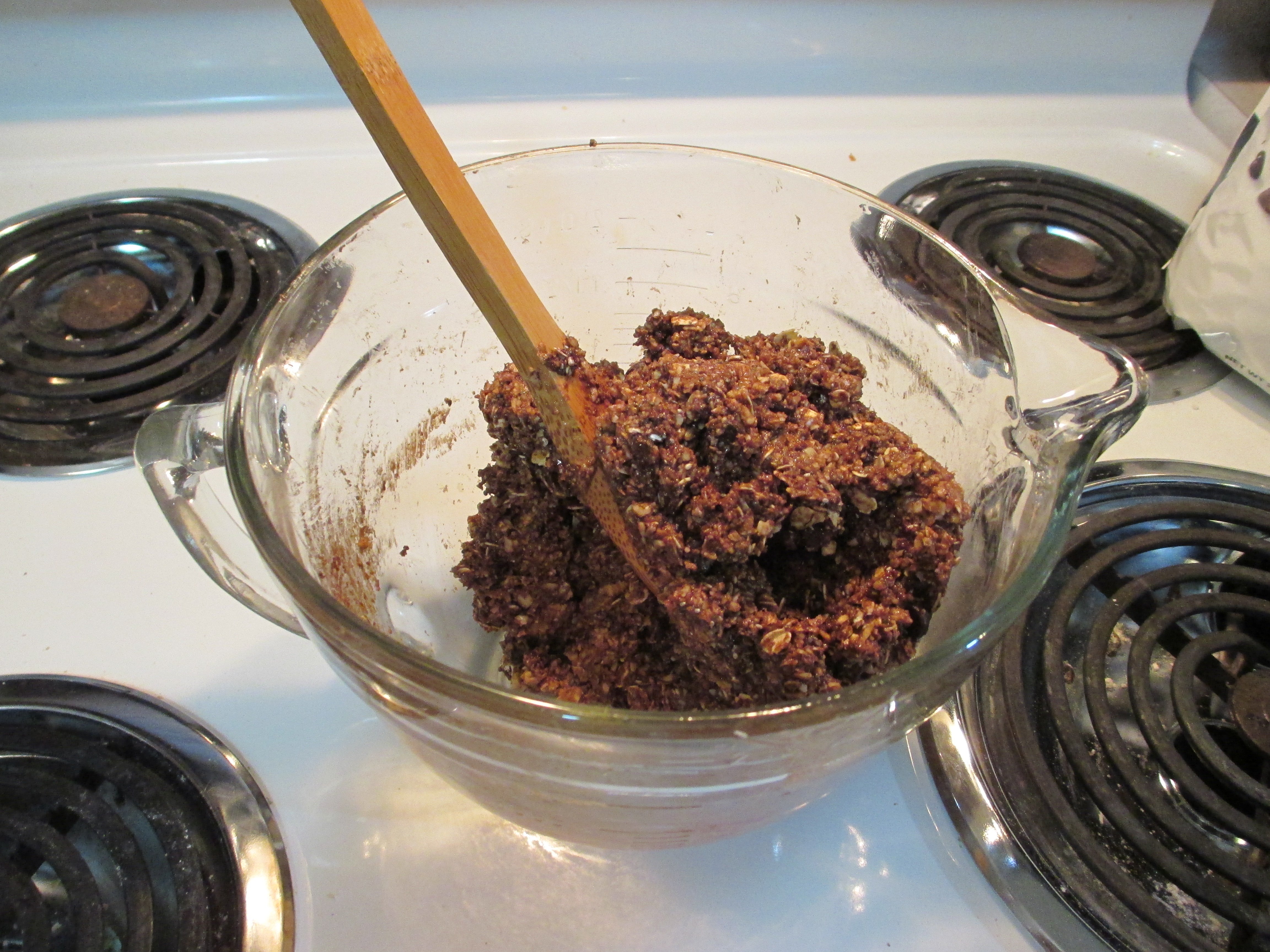 I added the cocoa, because I like chocolate and since cocoa is actually good for you I like adding it whenever I can. I also thought it would help balance the walnut. I used quick oats instead of old fashioned, because I had them on hand and wanted to use them up. The coconut oil was because was using the last of a big jar of natural peanut butter and it was really dry. The second batch ended up softer – I used regular creamy peanut butter. I might fiddle with the recipe a bit to deal with that.
