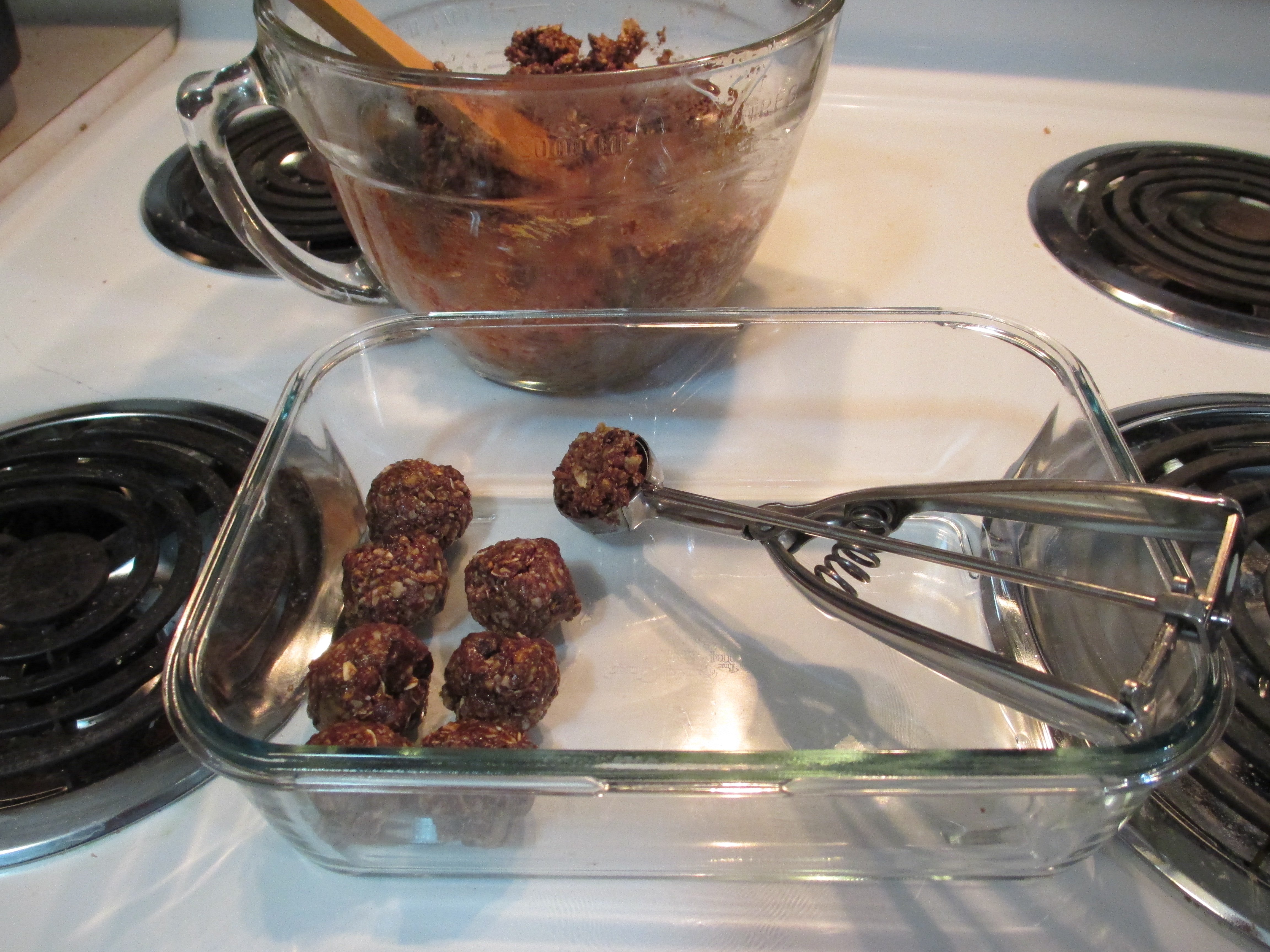 Just mix it all together, then form into balls. The Pampered Chef Small Cookie Scoop (1T) is a good size. I scoop them with the scoop, then shape them into balls, using a wet hand.
