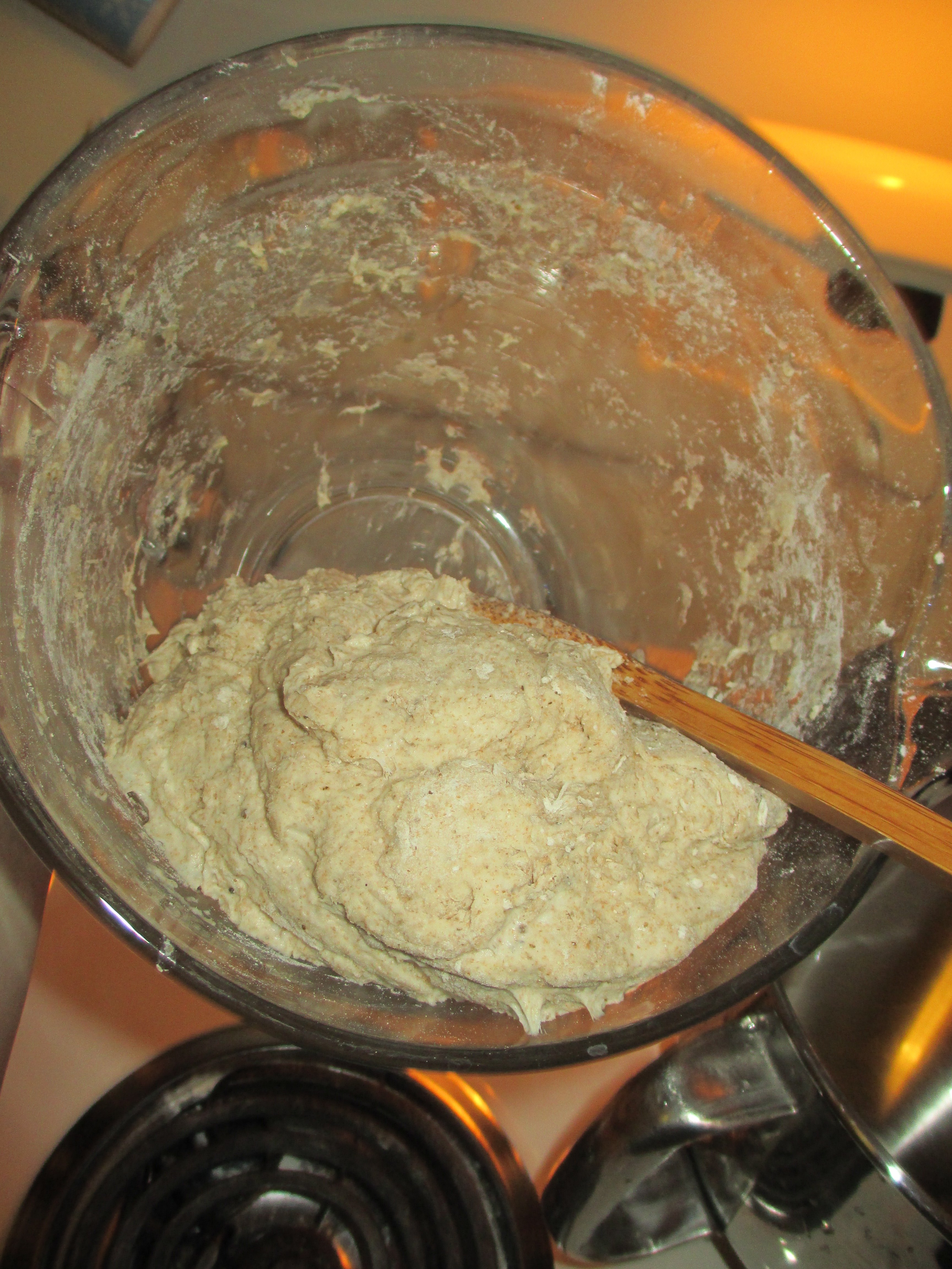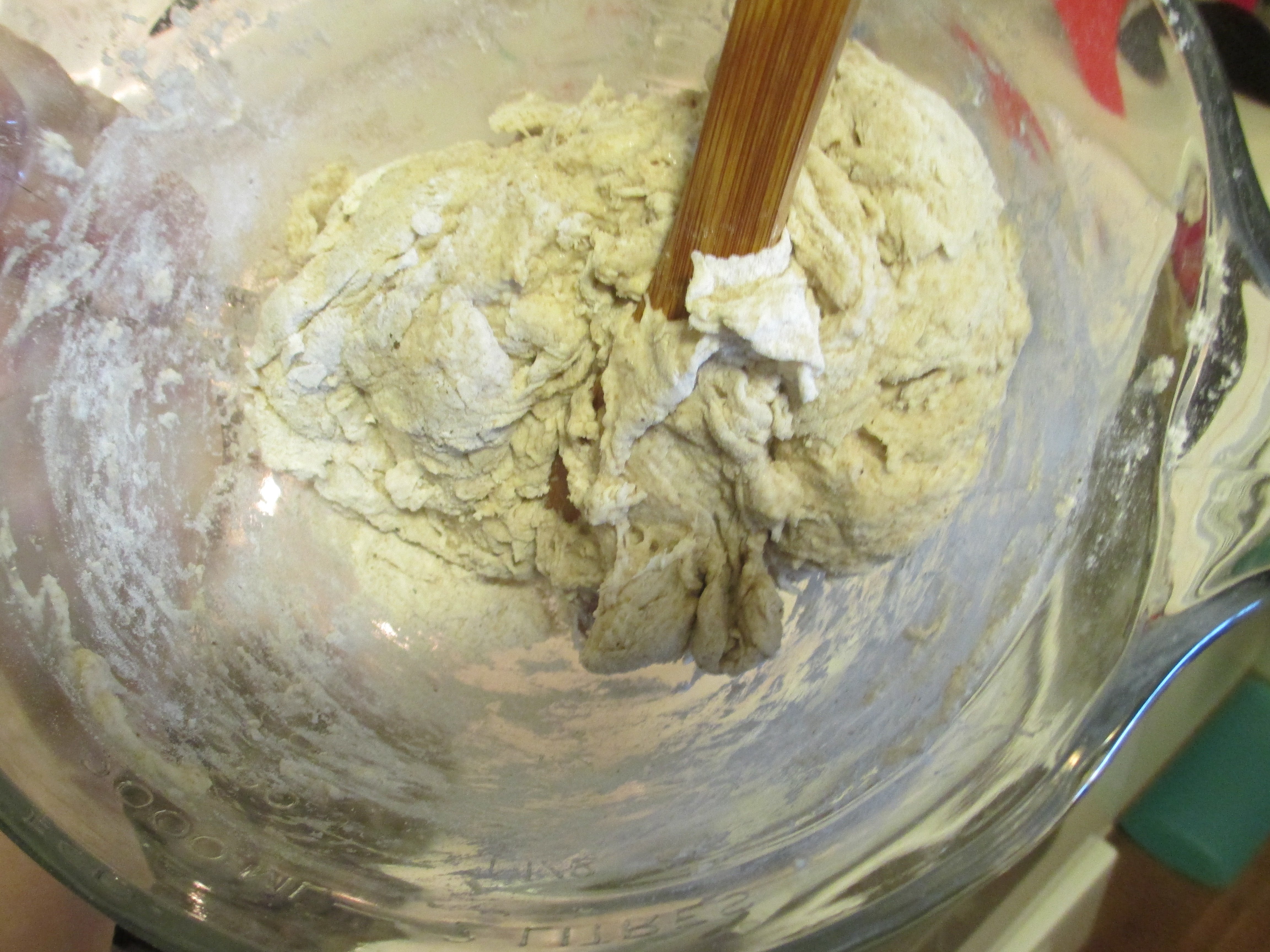 The dough will be stickier than normal for bread dough. (Below is well mixed.)