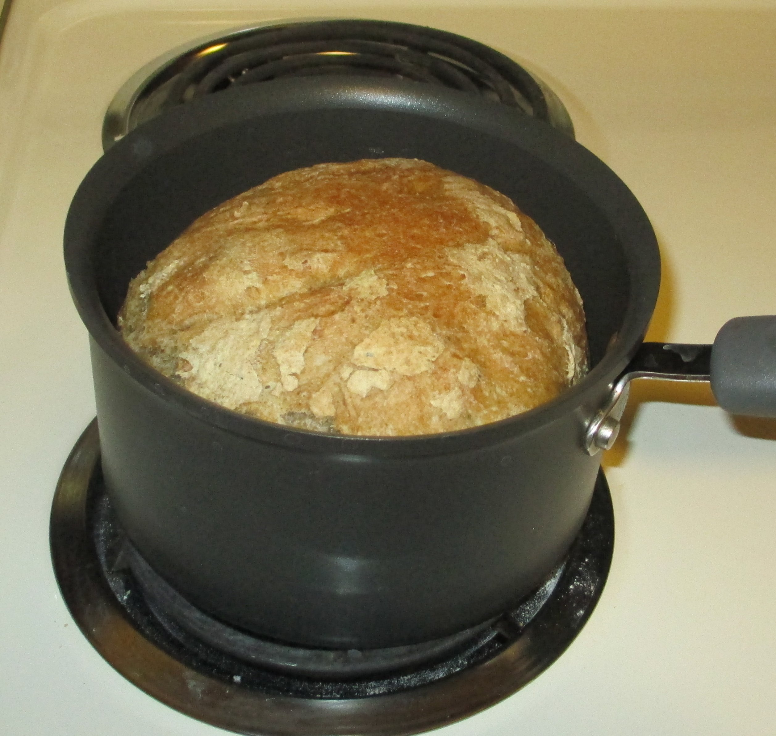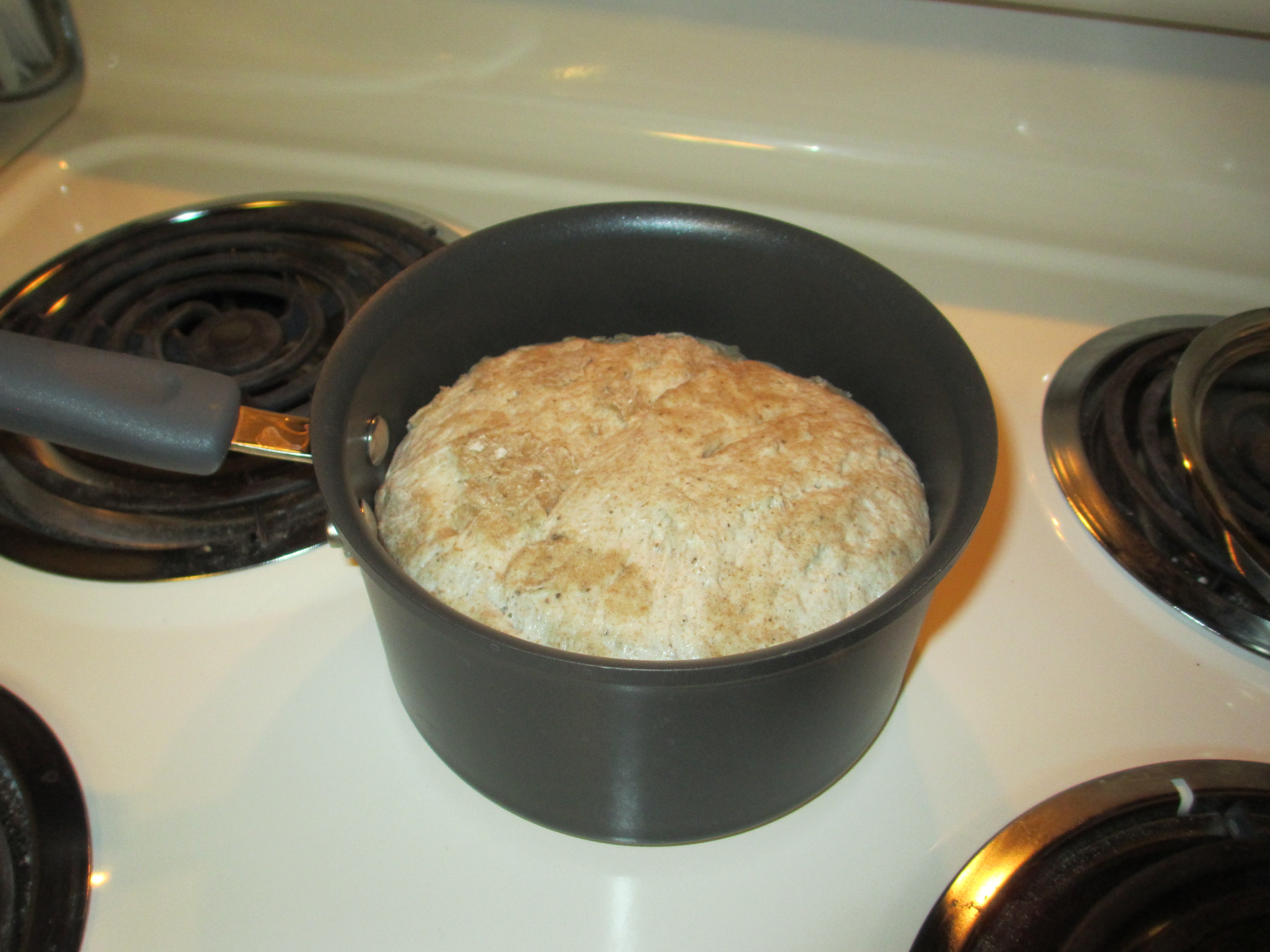 Dump it into an oven-safe cooking sauce pan. I have a 2 qt I like, but I have also had good results in a bigger pot – the bread is just wider and flatter.